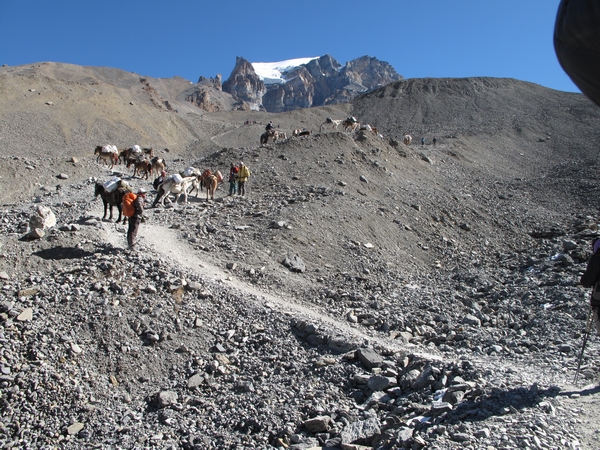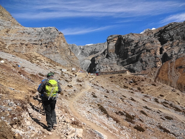 La montée se poursuit dans un paysage de plus en plus minéral. Le lodge de Thorong Phédi est enchassé dans un beau cirque très rocheux. |