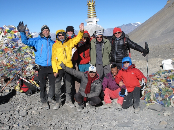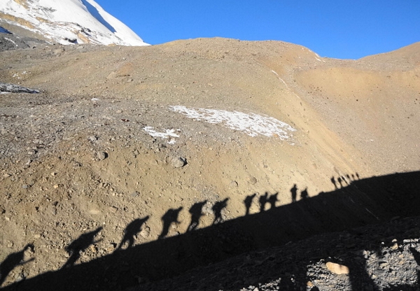 | Après un lever à 4 h 30, nous gravissons lentement,dans une température de -20°, les pentes qui nous amènent au sommet du Thorong Pass à 5416 m. | |